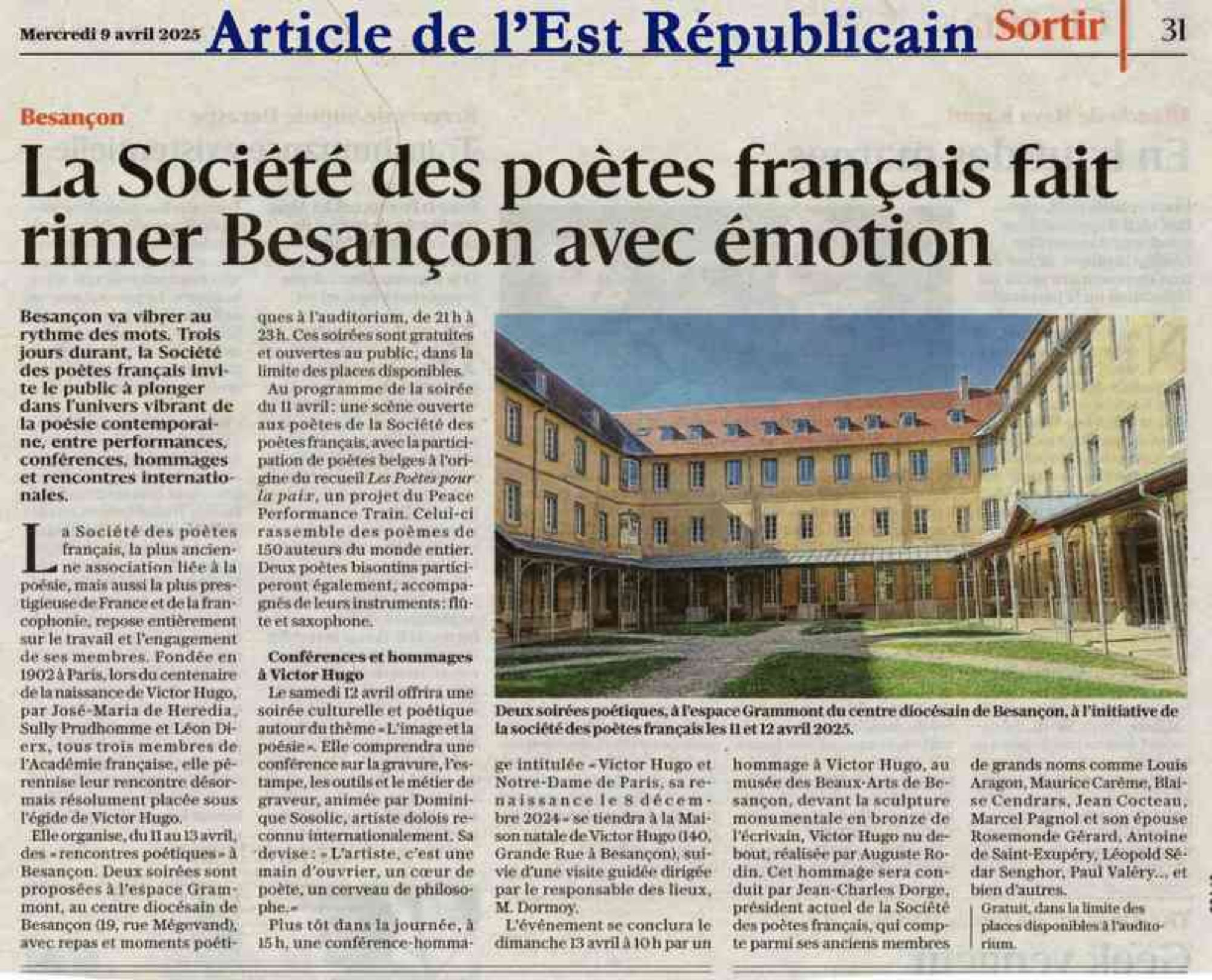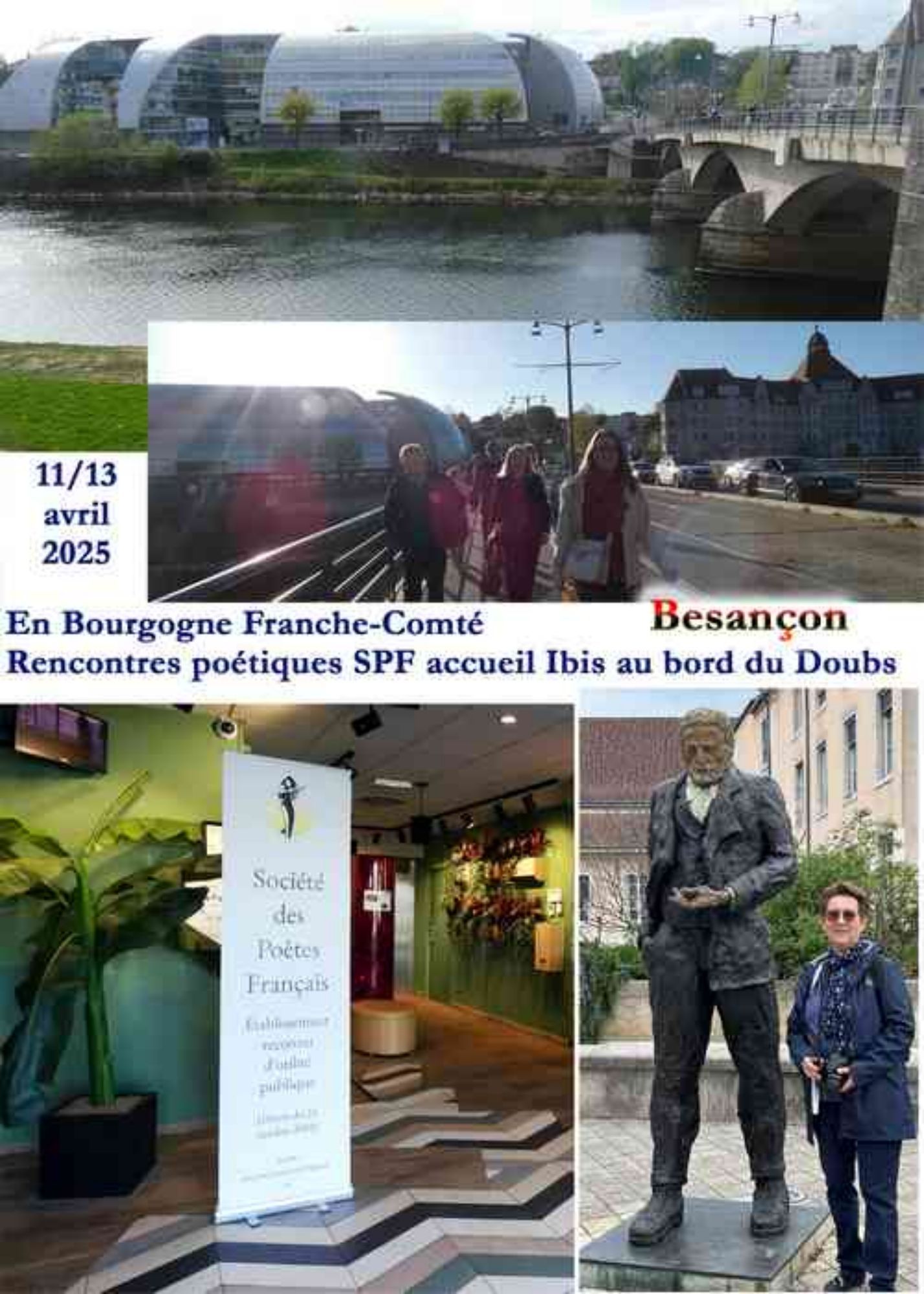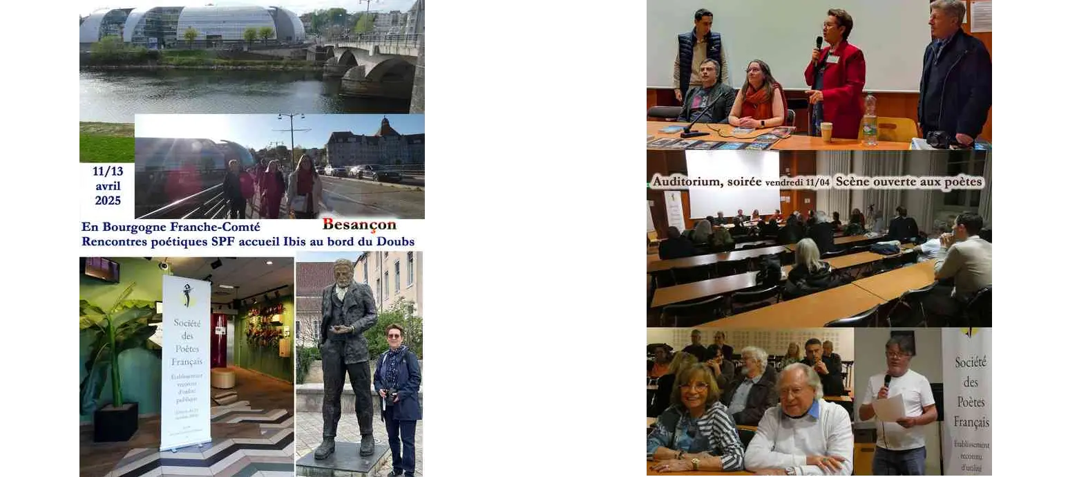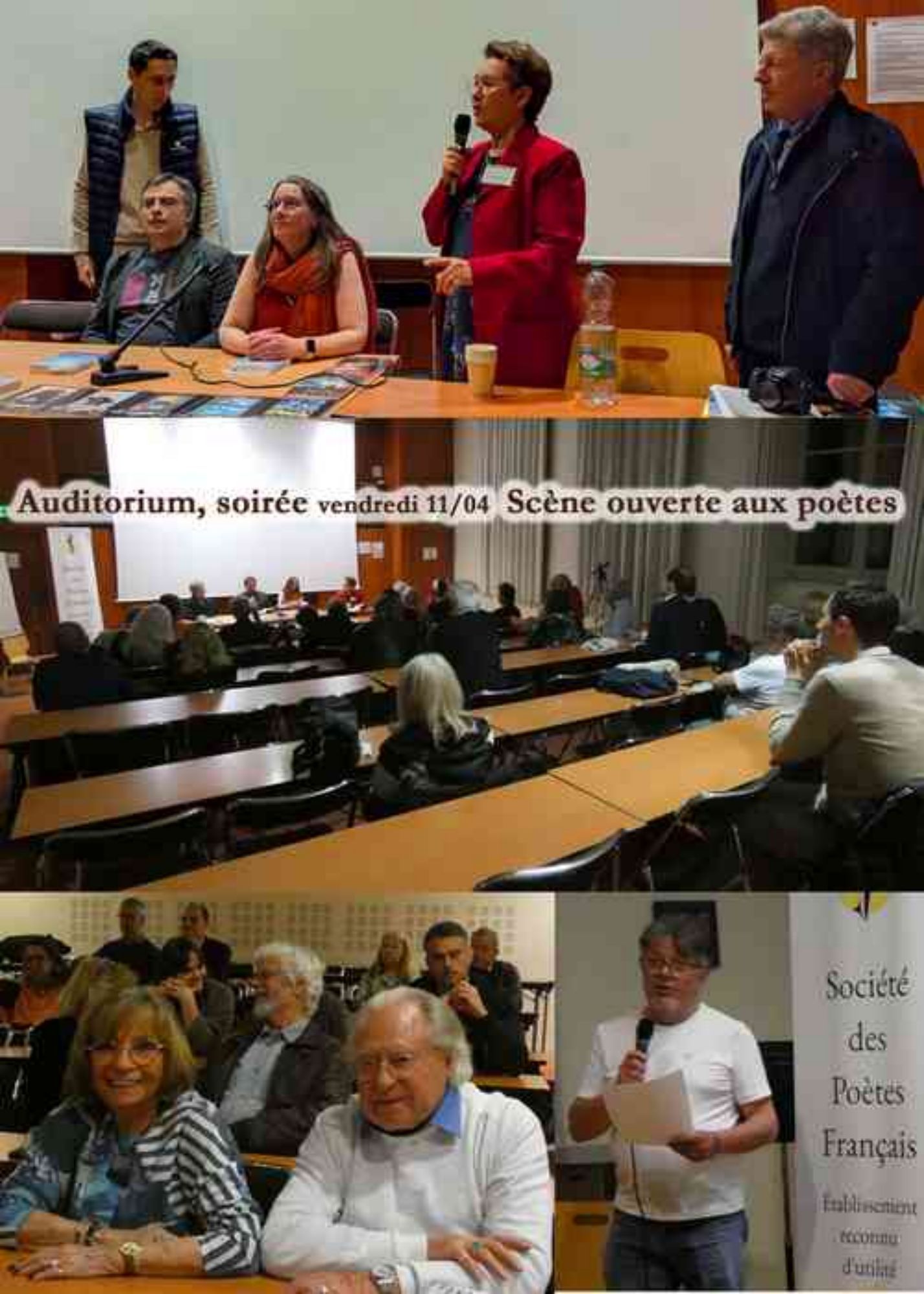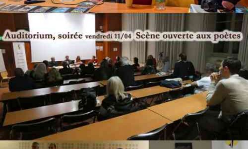 Puis, soirée poétique à l’auditorium. Scène ouverte aux poètes de la Société des Poètes Français avec la participation de poètes Belges, initiateurs du recueil "Les Poètes pour la Paix", un projet de Peace Performance Train : poèmes de 150 poètes de tous les pays, lus par eux-mêmes Valérie Antoine, Valéry Dvoinikov, Jean-Charles Dorge, Annick Gautheron,, Michel Bénard, Éliane Hurtado, Daniel Berghezan, Marité, Anne-Sophie Boutry, Roselyne Chevalier, Nicolas Minair, Romain Dubos, Isabel Aguilar ; une chanson chantée par son auteur Jean Pierre Jacquemin et 2 poètes bisontins Anne et Bruno accompagnés de leurs instruments, flûte et saxophone.