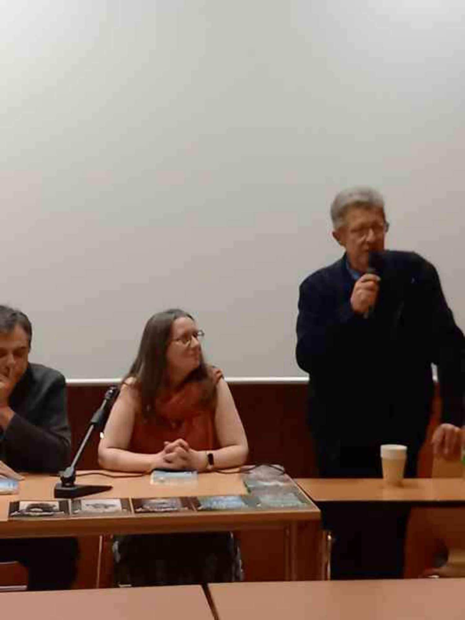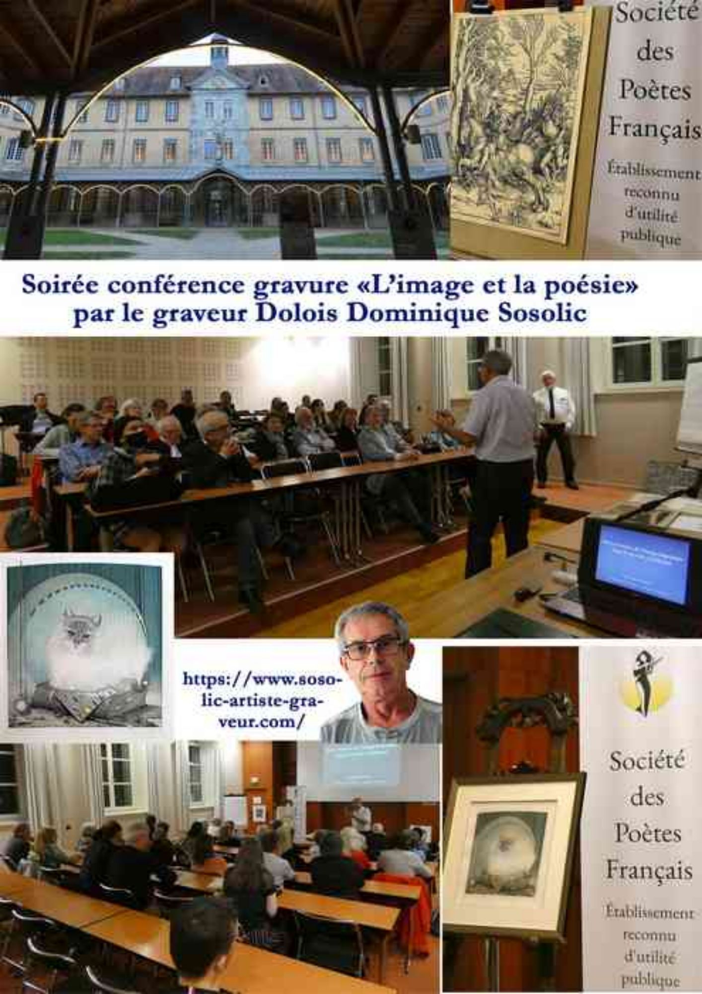 * De nouveau, un excellent souper dans la salle à manger du Centre Diocésain, en compagnie de Mr Sosolic et de son épouse, avant sa conférence : « Image et Poésie », sur la gravure, l'estampe, les outils, son métier de graveur. Dominique Sosolic. https://www.sosolic-artiste-graveur.com/vente-estampe-dominique-sosolic-graveur. Artiste Dolois d'exception, reconnu internationalement, dont la devise est : « L'artiste, c'est une main d'ouvrier, un cœur de poète, un cerveau de philosophe ». Il nous expliqua le cheminement créateur qui l’a conduit à sa gravure représentant l’écriture, intitulée « Sator », faisant partie du triptyque avec Requiem et Espace-Temps (musique, mathématique, écriture). Chacun put découvrir ses œuvres.