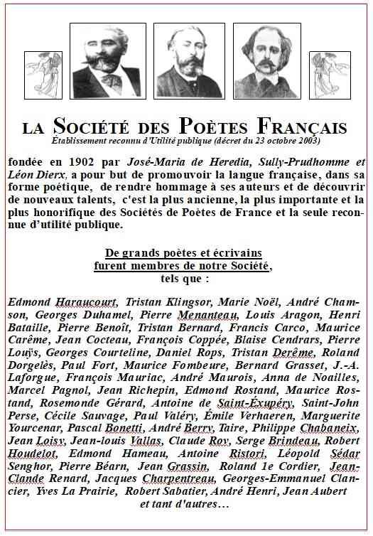 La Société des Poètes Français a été fondée en 1902, par José-Maria de Hérédia, Sully Prudhomme et Léon Dierx, tous trois de l’Académie française, à l’occasion de la célébration du premier centenaire de la naissance de Victor Hugo.